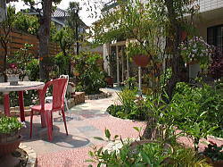 タイル掃除などの水も、うまく花壇へ流れるように工夫をしました。